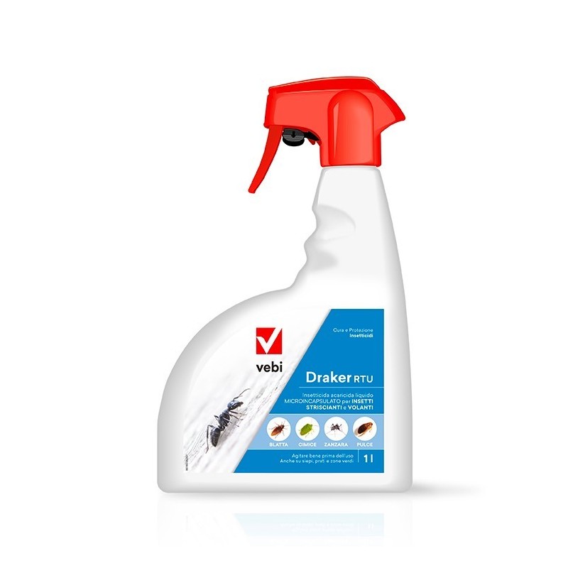 DRAKER RTU è un insetticida acaricida liquido microincapsulato pronto all’uso a largo spettro d’azione e lunga persistenza. É efficace nel controllo degli insetti striscianti e volanti, eliminando gli insetti presenti al momento del trattamento e prevenendo l’insorgere di successive infestazione per 2-3 settimane. Massima abbattenza ed efficacia prolungata.