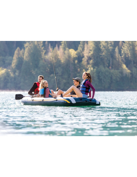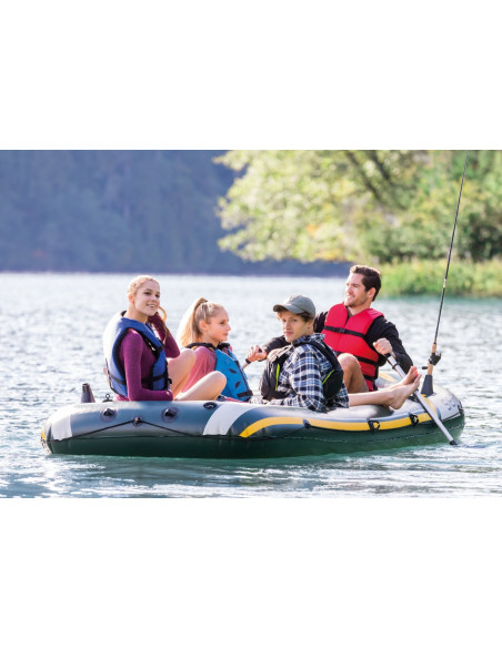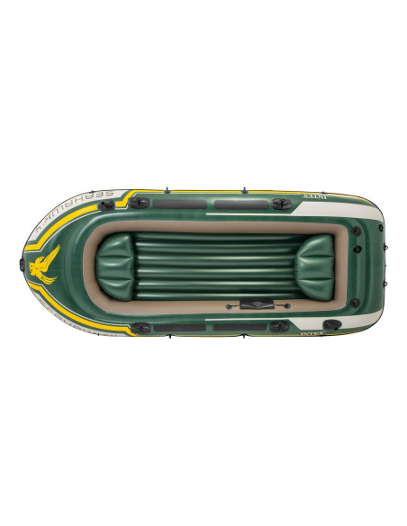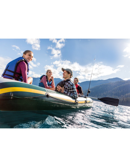 Il Seahawk 4 Intex è il gommone perfetto per rendere la vostra vacanza piena di emozioni, è l'ideale per divertenti escursioni, gite lungo laghi e fiumi per apprezzare la natura e la vita all'aria aperta. Progettato per 4 persone, costruito in resistente PVC, ha un fondo con travi a I, tre camere d'aria di cui una ausiliaria per garantire maggiore sicurezza. Che si tratti di una giornata a pesca o una gita rilassante sul fiume o sul lago, il gommone Seahawk 4 è l'imbarcazione ideale per rendere la vostra esperienza in barca emozionante, sicura e divertente. Accessoriato con 2 comodi cuscini per offrire comfort e stabilità durante la navigazione, l'imbarcazione è dotata di una pratica bitta di ormeggio a prua per assicurarla facilmente all'ormeggio, due valvole di gonfiaggio rapido Boston per gonfiare e sgonfiare velocemente il gommone, due porta canne da pesca, una borsa porta oggetti, il set di remi da cm. 138 e una pratica pompa manuale Intex completano la dotazione del Sea Hawk. La pesca e il relax non sono mai stati così facili. Con le dimensioni di cm. 351x145x48 il gommone è omologato con lo standard ISO 6185-1 NMMA ABYC. Per completare l'equipaggiamento sono inclusi gli attacchi per il montaggio del motore.