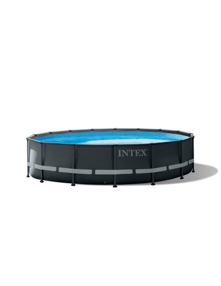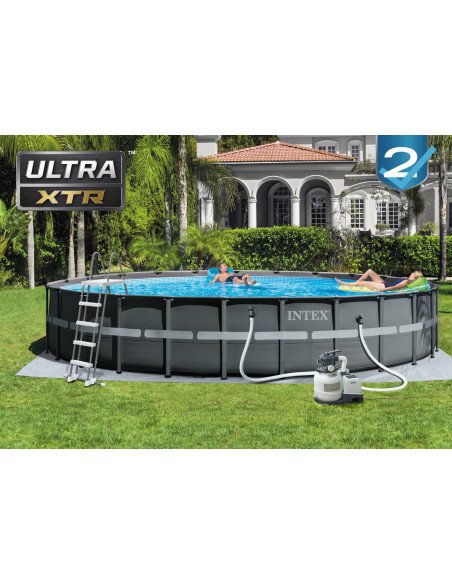Piscina Ulta Frame 26356 XTR cm. 732x132 rotonda con elegante struttura portante e scaletta, pompa a sabbia per il filtraggio dell'acqua e teli di copertura e base, robusto ed elegante perfetto per godersi indimenticabili momenti di relax nel proprio giardino. La piscina contiene 47,241L di acqiua. Il modello di piscina intex 26340 ultra frame rotonda è l'elegante evoluzione delle tradizionali piscine fuori terra intex ultra frame. è inoltre una versione più facile da assemblare grazie ad un ottimo metodo per cui non servono più clip per collegare le parti metalliche. La struttura metallica della piscina è di acciaio galvanizzato per una ottima resistenza alla ruggine e alla corrosione. Ha uno spessore ed una sezione ottimi rispetto i modelli frame tradizionali per aumentare la resistenza alla pressione dell'acqua ed all'utilizzo da parte del consumatore. Tutti gli spigoli sono arrotondati e smussati per la sicurezza dei bambini. Il PVC utilizza la tecnologia super – tough e si compone di tre strati: uno strato interno ed esterno in PVC spesso e resistente e uno intermedio in poliestere.