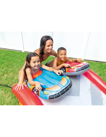 Simpatico scivolo acquatico lungo 5 m che include due macchinine gonfiabili per divertenti e appassionanti sfide con gli amici.